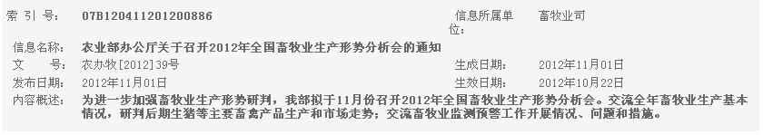為進(jìn)一步加強(qiáng)畜牧業(yè)生產(chǎn)形勢(shì)研判,我部擬于11月份召開(kāi)2012年全國(guó)畜牧業(yè)生產(chǎn)形勢(shì)分析會(huì)?,F(xiàn)將有關(guān)事宜通知如下。