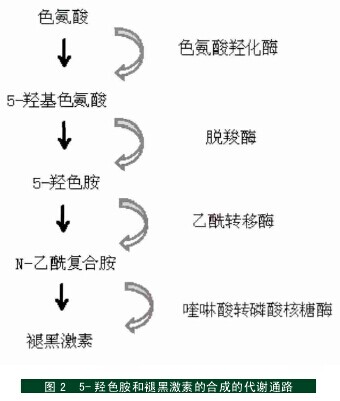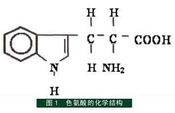 除蛋白質(zhì)合成以外,色氨酸同時(shí)還參與許多復(fù)雜的代謝通路。一旦被小腸吸收,色氨酸將進(jìn)入門靜脈,經(jīng)過肝臟,一部分用于蛋白合成,剩下的主要參與以下兩個(gè)主要的代謝通路:首先小部分色氨酸主要在腸道、血小板和腦中用于合成神經(jīng)傳遞素5-羥色胺;第二條代謝通路是犬尿氨酸通路,主要是合成3-羥基犬尿氨酸、3-羥基氨基苯甲酸、喹啉酸、犬尿喹啉酸和煙酸(Brown,1995)。哺乳動(dòng)物血漿中的色氨酸90%是與白蛋白結(jié)合在一起的,其余以游離的形式存在,經(jīng)血腦屏障進(jìn)入大腦(BBB;Madras,etal.,1974),并在松果體細(xì)胞中的色氨酸羥化酶作用下轉(zhuǎn)變成5-羥基色氨酸,并最終經(jīng)過脫羧轉(zhuǎn)變成5-羥色胺(圖2)。作為神經(jīng)傳遞素,5-羥色胺參與調(diào)節(jié)大量的行為過程,如食欲、采食、沖動(dòng)、侵略、性行為、溫度調(diào)節(jié)、疼痛感知和情緒控制。作為一個(gè)神經(jīng)激素,褪黑激素在控制動(dòng)物晝夜節(jié)律中發(fā)揮作用,并作為細(xì)胞內(nèi)清道夫,清除羥基和超氧自由基(Reiteretal.,1994)。