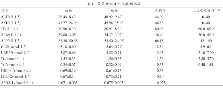 本研究測定的榮昌豬12項(xiàng)血液生化指標(biāo)中,AST、UREA、LDL-C、TP、TC、TG、HDL-C 7項(xiàng)指標(biāo)無顯著的性別差異,而ALT、GLU、ALB、ALP、APOAⅠ 5項(xiàng)指標(biāo)存在顯著或極顯著的性別差異。與其他中國地方豬種比較,不同指標(biāo)在不同豬種中研究的結(jié)果并不一致:如TC在榮昌豬中未表現(xiàn)顯著的性別差異,這與在藏豬、五指山豬和安慶六白豬中研究結(jié)果一致,而在莆田黑豬、合作豬和皖南花豬中卻表現(xiàn)顯著的性別差異;ALP在榮昌豬中均表現(xiàn)出顯著的性別差異,榮昌公豬ALP極顯著高于榮昌母豬,這與在藏豬中研究結(jié)果一致,但在莆田黑豬、五指山豬和合作豬中未表現(xiàn)顯著的性別差異。
