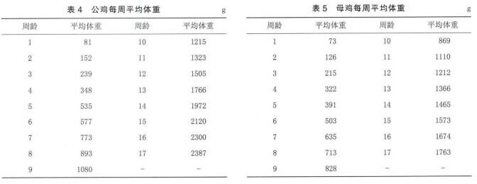 本次試驗(yàn)公母分群飼養(yǎng)。每周測定隨機(jī)抽樣體重,即公、母雞各隨機(jī)抽取60只稱重,然后算出整群平均重。公雞每周平均體重見表4,母雞每周平均體重見表5。