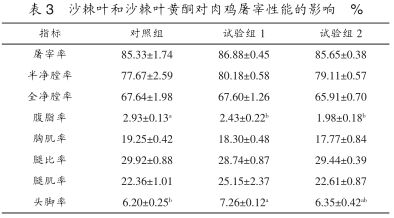 結(jié)果顯示,在本試驗條件下,添加3%沙棘葉和 0.05%沙棘葉黃酮較對照組都能提高肉雞的日增重,但沙棘葉組效果不顯著(P>0.05),沙棘葉黃酮組的增重效果顯著(P<0.05);添加 3%沙棘葉組、0.05%沙棘葉黃酮組顯著降低腹脂率(P<0.05),較對照組顯著提高頭腳率(P<0.05),其余屠宰性能指標各組間差異均不顯著(P>0.05);添加3%沙棘葉和0.05%沙棘葉黃酮對血液生化指標均無顯著影響(P>0.05)。