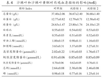 在本試驗條件下,添加3%沙棘葉和0.05%沙棘葉黃酮較對照組都能提高肉雞的日增重,顯著降低腹脂率,對血液生化指標均無顯著影響。