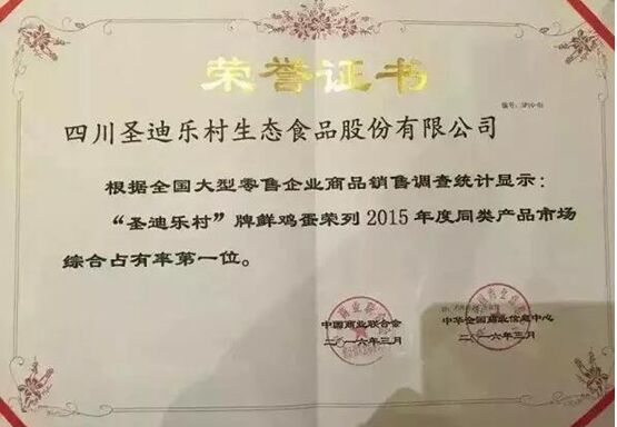 3月30日,在蘇州舉行的2016中國消費(fèi)市場(chǎng)發(fā)展年會(huì)上,圣迪樂村雞蛋再次奪得2015年度鮮蛋市場(chǎng)占有率第一,這是繼2012、2013、2014年第四次奪魁,蟬聯(lián)四連冠!圣迪樂村雞蛋也是第一個(gè)連續(xù)四年獲得第一的品牌。