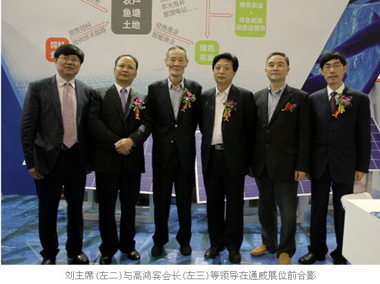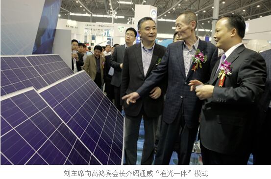開幕式結(jié)束后,高鴻賓會(huì)長等一行領(lǐng)導(dǎo)在劉主席的陪同下到通威展臺(tái)參觀,劉主席向高會(huì)長詳細(xì)地介紹了通威“漁光一體”創(chuàng)新模式。通威“漁光一體”項(xiàng)目以光伏發(fā)電站為主,漁業(yè)養(yǎng)殖為輔,結(jié)合通威365健康養(yǎng)殖模式,拓展了通威太陽能光伏技術(shù)應(yīng)用領(lǐng)域,通過“水上產(chǎn)出清潔能源、水下生產(chǎn)安全通威魚”,達(dá)到光伏發(fā)電與漁業(yè)養(yǎng)殖的一體化有機(jī)結(jié)合,實(shí)現(xiàn)了“魚、電、環(huán)?!比S收。