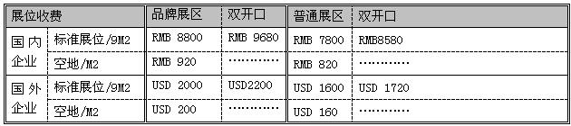 注:1.標準展位包括地毯、三面圍板、公司名稱楣板、咨詢桌一張、折椅兩把、射燈兩盞、電源插座一個(特殊用電請事先說明,另行收費)。