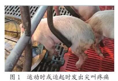 發(fā)病迅速,感染病原后幾天內(nèi)就發(fā)病。出現(xiàn)體溫高、反應(yīng)遲鈍,運(yùn)動時(shí)或迫起時(shí)發(fā)出尖叫疼痛(見圖1),某些豬由于發(fā)生腦膜炎而表現(xiàn)肌肉震顫、麻痹、驚厥。病豬四肢關(guān)節(jié)腫大,跛行,顫抖,共濟(jì)失調(diào),可視黏膜發(fā)紺,眼睛灰色或褐色,個別有眼球突出,而后漸行性消瘦(見圖2),最后死亡,從發(fā)病到死亡時(shí)間較長。