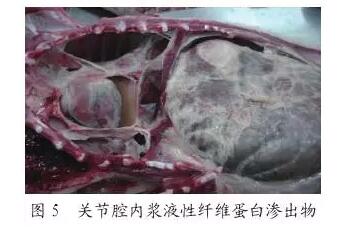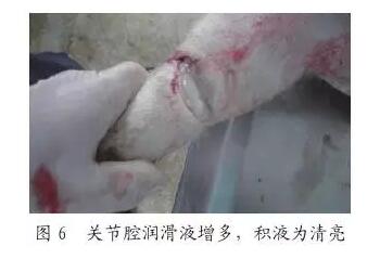 引起的關(guān)節(jié)炎、跗(見圖4),腕關(guān)節(jié)腫大、劇痛、瘸腿,用手一捏,疼得尖叫;剖檢關(guān)節(jié)腔內(nèi)有漿液性纖維蛋白滲出物(圖5),關(guān)節(jié)腔潤滑液增多,積液為清亮或微黃(圖6),關(guān)節(jié)腫大一般是對稱性的,而鏈球菌則不一定。