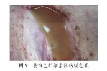 腹腔有明顯的纖維素性滲出,常出現(xiàn)腹腔臟器與腹膜粘連,嚴(yán)重的剖開腹腔后看不見腹腔臟器,整個腹腔勝器被黃白色纖維素性偽膜包裹(見圖9、圖10),并且腹水嚴(yán)重,伴發(fā)怪臭味。