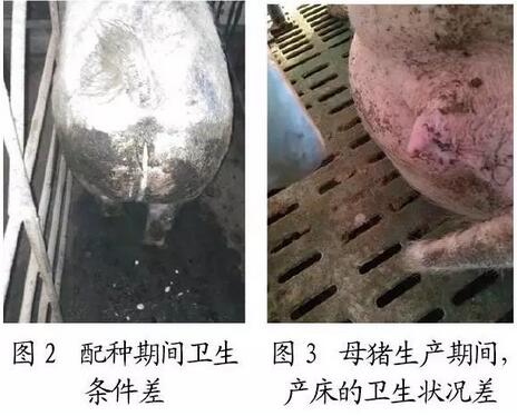 1、夏季高溫高濕,環(huán)境衛(wèi)生很容易變差,導(dǎo)致病原微生物大量繁殖,污染母豬陰戶開張時(shí)期(在產(chǎn)、發(fā)情、配種)的外陰和產(chǎn)道,有害細(xì)菌進(jìn)入子宮內(nèi)進(jìn)行繁殖而導(dǎo)致子宮炎的發(fā)生。圖2為配種期間的衛(wèi)生狀況差。圖3為母豬生產(chǎn)期間,產(chǎn)床的衛(wèi)生狀況差。