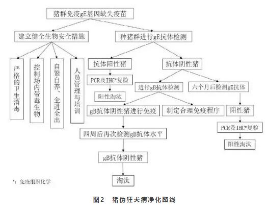 通過(guò)入群前的抗體篩查,保證入群后備母豬的偽狂犬野毒gE抗體陰性,從源頭上實(shí)現(xiàn)種豬群豬偽狂犬病的凈化,是豬偽狂犬病根除方案中的重要一環(huán):使用gE基因缺失疫苗對(duì)種豬群進(jìn)行合理免疫;持續(xù)監(jiān)測(cè)種豬群PRV?gE抗體以明確種豬群PRV野毒感染狀態(tài),對(duì)確診的帶毒豬進(jìn)行淘汰處理;同時(shí)監(jiān)測(cè)種豬群PRV?gB抗體的免疫應(yīng)答狀態(tài),對(duì)PRV?gB抗體持續(xù)陰性的豬也要進(jìn)行淘汰。豬偽狂犬病凈化路線見(jiàn)圖2。