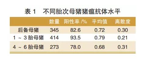 許多中小型豬場基本是通過臨床是否發(fā)病來判斷免疫效果;集團化、大型豬場,大都進行實驗室檢測予以判定。2017年第2季度對4個不同省份28個場的豬瘟抗體檢測數(shù)據(jù)進行分析,結果發(fā)現(xiàn)不同胎次組母豬豬瘟抗體水平不同(見表1):4~7胎母豬抗體水平顯著低于后備母豬和1~3胎母豬??梢哉f,母豬胎次對豬場豬瘟抗體合格率具有重要影響,及時淘汰生產(chǎn)繁殖性能差的老齡母豬不僅有助于提高豬場生產(chǎn)成績,也有助于提升豬群豬瘟抗體水平。