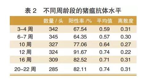 總之,種豬群免疫率100%,陽性率80%以上;保育豬群陽性率較低,低于70%。筆者在日常走訪豬場為其提供技術支持過程中發(fā)現(xiàn),仔豬群首免(斷奶前后)與加強免疫之間,大約有4~5周時間,抗體陽性率比較低,這是一個普遍現(xiàn)象。