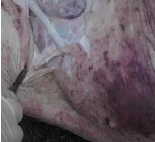 該豬場(chǎng)存欄保育后期、育肥前期的豬群約1?500余頭,50~120日齡,從2月上旬,相繼陸續(xù)發(fā)病,表現(xiàn)為精神沉郁,食欲減退,體溫升高為41~42℃,眼結(jié)膜潮紅,腹式呼吸,喘氣,四肢無(wú)力,趴臥地面,耳廓、腹部、四肢皮膚有紫紅色出血斑塊(圖1);有的豬晚上發(fā)病、早上死亡,口鼻流出血樣泡沫 ;有的關(guān)節(jié)腫大、跛行;有的保育仔豬頭頸歪斜,共濟(jì)失調(diào),走路搖晃,病程長(zhǎng)的保育仔豬嚴(yán)重消瘦。整個(gè)豬場(chǎng)自發(fā)病以后,發(fā)病率約為40%,死亡率約為15%,使用氟苯尼考、替米考星、強(qiáng)力霉素等,療效不明顯。