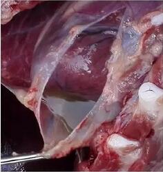 腹股溝淋巴結(jié)腫大(圖1),頜下淋巴結(jié)腫大;心包積液(圖2),心包液內(nèi)有少量的纖維性物質(zhì);有的豬心外膜有大量纖維素物質(zhì)包裹,呈絨毛心;氣管內(nèi)有大量出血泡沫液體;肺臟出血,呈紫紅色,有肉變區(qū),有的豬肺氣腫,切面流出泡沫樣液體;有的豬腎臟針尖狀出血點(diǎn);關(guān)節(jié)積液增多,內(nèi)有纖維絮狀物。