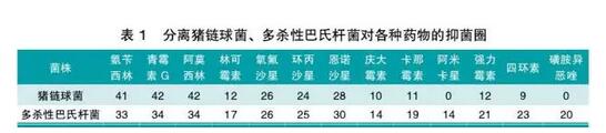 選擇18種藥物,采用紙片擴(kuò)散法,測(cè)定分離的豬鏈球菌和多殺性巴氏桿菌藥物敏感性,其結(jié)果見(jiàn)表1。結(jié)果表明豬鏈球菌和多殺性巴氏桿菌對(duì)氨芐西林、阿莫西林、青霉素、恩諾沙星、環(huán)丙殺沙星菌等敏感,因此,建議該養(yǎng)殖戶,針對(duì)發(fā)病嚴(yán)重豬只,使用氨芐西林、青霉素、或者恩諾沙星單獨(dú),或者聯(lián)合注射治療,同時(shí)使用阿莫西林拌料,適當(dāng)加大用藥劑量,連用5~7d。