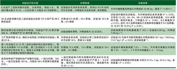 多個(gè)研究結(jié)果顯示,從母豬妊娠90d以后開(kāi)始,每天給母豬增加光照時(shí)間,可以提升母豬的泌乳力,增加仔豬吮乳次數(shù),提高仔豬的斷奶重。其原理為延長(zhǎng)光照時(shí)間提高了血液中催乳素的水平,催乳素作用于乳腺,刺激了氨基酸的攝取和乳糖的合成從而提高了泌乳量,滿足了仔豬生長(zhǎng)的營(yíng)養(yǎng)需求,從而促進(jìn)了仔豬的生長(zhǎng)。(各試驗(yàn)結(jié)果見(jiàn)表1)