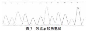 圖1以紅、藍(lán)、綠線的峰來通過單雙峰或套疊峰來判斷基因是否突變,綿羊FecB從編碼249位的谷氨酰胺(Q)突變成了精氨酸(R),即CAG突變成CGG,CGG即為突變后的精氨酸。通過基因比對,發(fā)現(xiàn)其發(fā)生突變,為純合子。