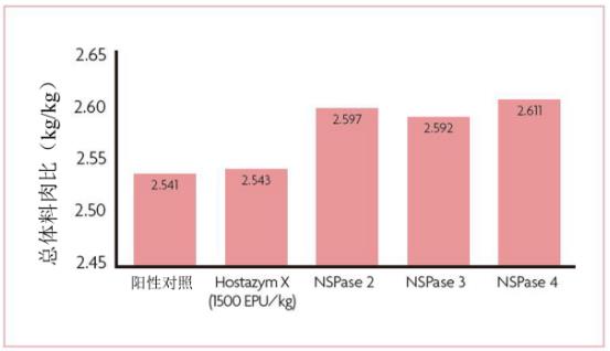 圖1. 將不同的NSPases添加到總體料肉比的結(jié)果-豬育肥試驗(yàn)(20-110kg)。