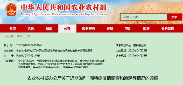 農(nóng)業(yè)農(nóng)村部公布近期3起非洲豬瘟疫情調(diào)查和追溯等情況