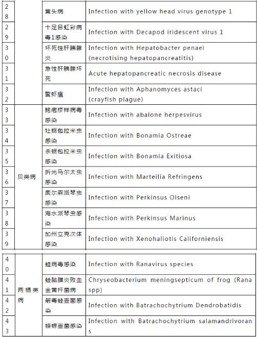 修訂后的《名錄》,包括水生動物疫病43種,均被列為二類進境疫病。新增了7種水生動物疫病,分別為:鮭魚甲病毒感染、鯉浮腫病毒病、羅非魚湖病毒病、細(xì)菌性腎病、急性肝胰腺壞死、十足目虹彩病毒1感染(蝦虹彩病毒?。┖拖旙⒒【腥?;刪除了8種水生動物疫病,分別為:對蝦桿狀病毒病、斑節(jié)對蝦桿狀病毒病、小瓜蟲病、黏孢子蟲病、 指環(huán)蟲病、河蟹顫抖病 、鮑膿皰病和鱉腮腺炎病。