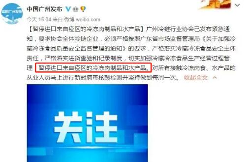 廣州冷鏈行業(yè)協(xié)會(huì)已發(fā)布緊急通知 暫停進(jìn)口來(lái)自疫區(qū)的冷凍肉制品和水產(chǎn)品