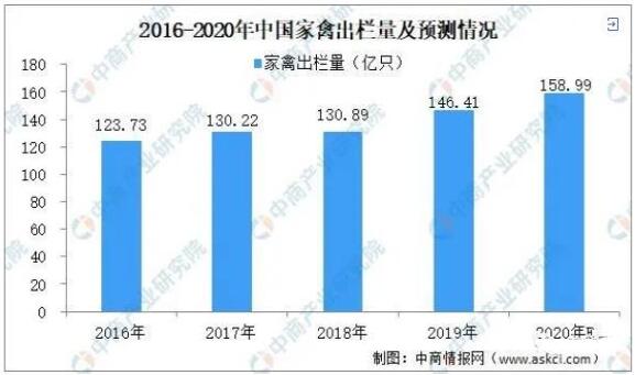 據(jù)國(guó)家統(tǒng)計(jì)局?jǐn)?shù)據(jù)顯示:2019年全國(guó)家禽出欄146.41億只,比2018年增加15.51億只,增長(zhǎng)11.9%;全國(guó)家禽存欄65.22億只,同比增加4.85億只,增長(zhǎng)8.0%。據(jù)預(yù)測(cè),2020年我國(guó)家禽出欄將近160億只。