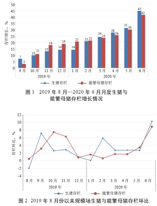 據(jù)監(jiān)測(cè),截至6月末,河南省全省規(guī)模豬場(chǎng)生豬存欄和能繁母豬存欄分別比2019年8月末增長(zhǎng)44.8%和41.7%(圖1),月均增幅分別達(dá)4.01%和2.70%(圖2),已連續(xù)10個(gè)月實(shí)現(xiàn)雙回升,比全國(guó)提前2個(gè)月。