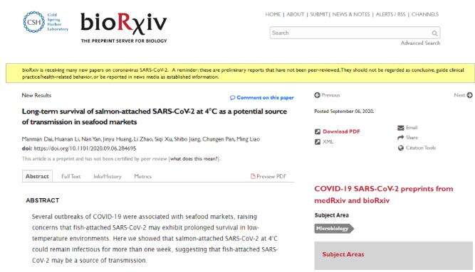 文章稱,在4攝氏度環(huán)境下,新型冠狀病毒附著三文魚上可存活一周以上,且仍具有感染性。因此,攜帶新冠病毒的三文魚可能是國際傳播源之一。包括彭博社(Bloomberg)、福克斯新聞(Fox News)在內(nèi)的多家國外主流媒體進行了重點報道,文章亦被UCN轉(zhuǎn)譯。