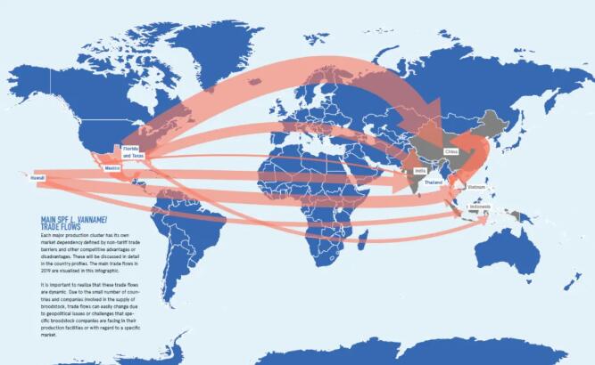 報告指出,2019年全球SPF南美白蝦種蝦市場容量在140-170萬尾(各國市場需求量如下),每尾平均售價55美元,總產(chǎn)值在7,700萬美元至9,500萬美元之間。SPF種蝦市場集中在亞洲,大市場有中國、印度、印尼、泰國和越南,小市場如馬來西亞、菲律賓、韓國、斯里蘭卡和臺灣。南美洲國家,如厄瓜多爾,擁有本地種蝦生產(chǎn)系統(tǒng),不依賴進(jìn)口,生物安全性較弱。巴西、墨西哥、危地馬拉等新興養(yǎng)殖國有望成為未來進(jìn)口種蝦市場。