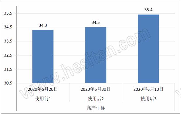實驗前共計飼喂了118頭高產(chǎn)奶牛和148頭產(chǎn)后牛,其中因調(diào)群只有48頭高產(chǎn)牛還在原圈舍。5月20日這48頭牛平均泌乳天數(shù)118天;5月27日開始飼喂發(fā)酵飼料時泌乳天數(shù)125天,此時這48頭平均單產(chǎn)34.5kg;直到6月10日時泌乳天數(shù)138天,此時平均單產(chǎn)35.4kg。以上即是兩個月內(nèi)未調(diào)群一直飼喂發(fā)酵飼料的高產(chǎn)牛只,產(chǎn)量變化略有增長,前后產(chǎn)量增加1.1kg,前期實驗數(shù)據(jù)主要集中驗證產(chǎn)量是否有所變化,本身這部分牛泌乳天數(shù)120天左右,屬于剛進入泌乳高峰的牛群,產(chǎn)量能夠增加是肯定的;當數(shù)據(jù)出來后發(fā)現(xiàn),產(chǎn)量增加比較明顯,主要是飼喂時間短,對產(chǎn)量有提升這一點比較合理。