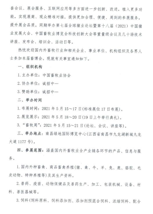 一、畜博會(huì)召開地點(diǎn):南昌綠地國際博覽中心(江西省南昌市九龍湖新城九龍大道1177號(hào)),時(shí)間:2021年5月18~20日(15-17日布展,19日開幕典禮)。