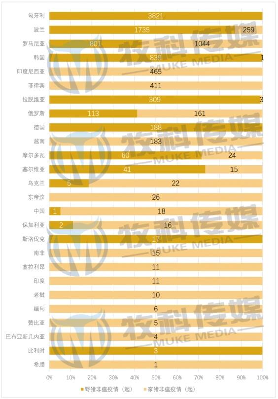 2020年,13個(gè)歐洲國家(匈牙利、波蘭、羅馬尼亞、拉脫維亞、俄羅斯、德國、摩爾多瓦、塞爾維亞、烏克蘭、保加利亞、斯洛伐克、比利時(shí)、希臘)、9個(gè)亞洲國家(韓國、印度尼西亞、菲律賓、越南、東帝汶、中國、印度、老撾、緬甸)、3個(gè)非洲國家(南非、塞拉利昂、贊比亞)、1個(gè)大洋洲國家(巴布亞新幾內(nèi)亞)報(bào)告了非洲豬瘟疫情。其中,匈牙利共報(bào)告了3821起非洲豬瘟疫情,居首位。
