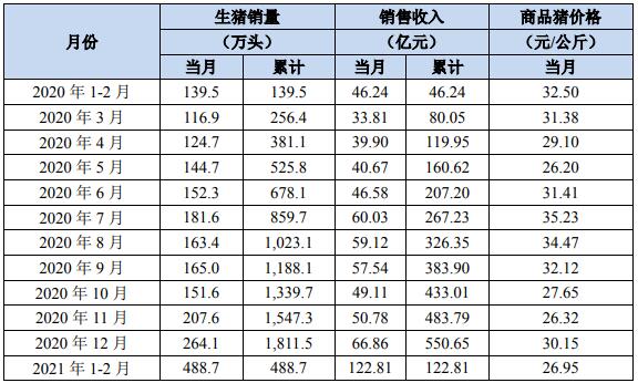 2021年1-2月份,公司銷售生豬488.7萬(wàn)頭,銷售收入122.81億元。其中向全資子公司牧原肉食品有限公司(簡(jiǎn)稱“牧原肉食”)銷售生豬27.8萬(wàn)頭。