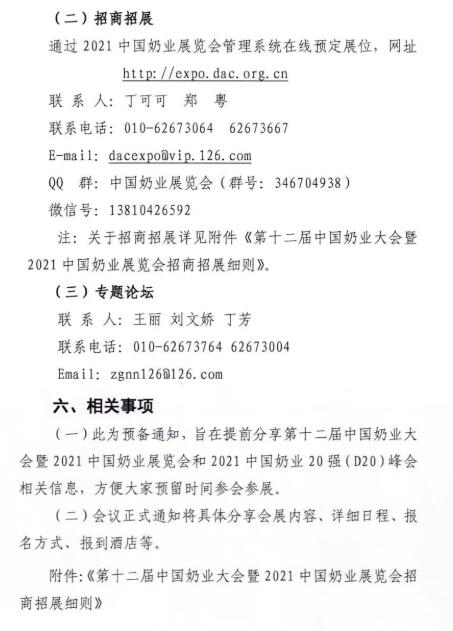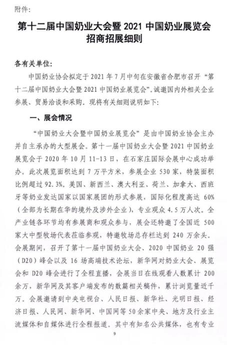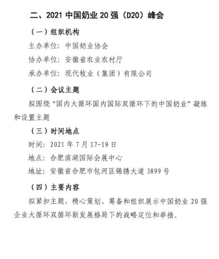 “十四五”時期是我國在全面建成小康社會、實現(xiàn)第一個百年奮斗目標之后,乘勢而上開啟全面建設社會主義現(xiàn)代化國家新征程、向第二個百年奮斗目標進軍的第一個五年。2021年是“十四五”開局之年,在“兩個一百年”歷史交匯點上,為深入貫徹落實黨和國家領(lǐng)導人有關(guān)講話指示和十九屆五中全會精神,在農(nóng)業(yè)農(nóng)村部、安徽省人民政府的鼎力支持下,中國奶業(yè)協(xié)會將圍繞“全面總結(jié)‘十三五’奶業(yè)成就,系統(tǒng)謀劃‘十四五’戰(zhàn)略發(fā)展”,擬定于2021年7月中旬在合肥市召開第十二屆中國奶業(yè)大會暨2021中國奶業(yè)展覽會和2021中國奶業(yè)20強(D20)峰會,按照國家第十四個五年規(guī)劃總體要求,貫徹新發(fā)展理念,開創(chuàng)新發(fā)展格局,促進奶業(yè)全面振興,推動奶業(yè)高質(zhì)量發(fā)展,為全面建設現(xiàn)代化奶業(yè)開好局、起好步?,F(xiàn)將有關(guān)事宜通知如下: