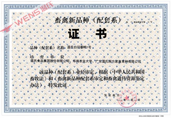 近日,農(nóng)業(yè)農(nóng)村部公布了國(guó)家畜禽新品種及配套系、遺傳資源名單(第381號(hào)),經(jīng)國(guó)家畜禽遺傳資源委員會(huì)審定、鑒定,共有30個(gè)品種資源獲得通過并頒發(fā)證書,溫氏白羽番鴨1號(hào)位列其中(證書編號(hào):農(nóng)17新品種證書第12號(hào))。值得一提的是,溫氏白羽番鴨1號(hào)是國(guó)內(nèi)首個(gè)通過國(guó)家審定的番鴨品種,突破了番鴨“卡脖子”種質(zhì)資源問題。