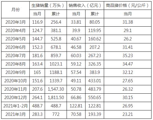 2021年3月份,公司商品豬銷售均價(jià)23.21元/公斤,比2021年1-2月份下降13.88%。