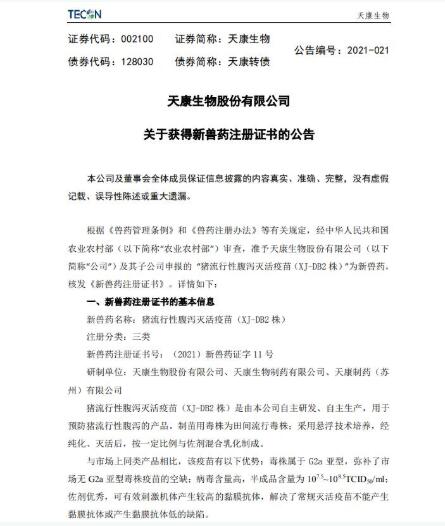 天康生物4月12日公告,經(jīng)農(nóng)業(yè)農(nóng)村部審查,準(zhǔn)予公司及其子公司申報(bào)的“豬流行性腹瀉滅活疫苗(XJ-DB2株)”為新獸藥,核發(fā)《新獸藥注冊(cè)證書(shū)》。