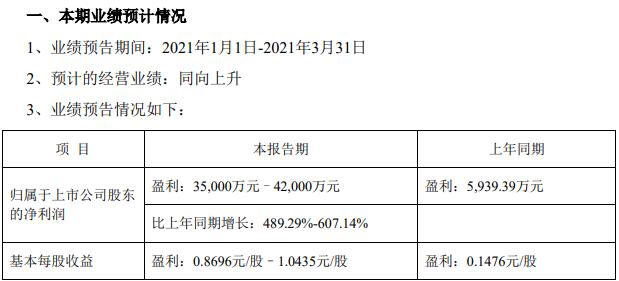 京基智農(nóng)4月15日披露2021年一季度業(yè)績預(yù)告,預(yù)計一季度歸屬于上市公司股東的凈利潤3.5億元-4.2億元,比上年同期增長489.29%-607.14%;基本每股收益0.8696元-1.0435元。