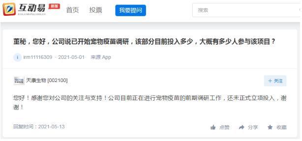 5月13日,天康生物在回復(fù)投資者提問(wèn)時(shí)表示,公司目前正在進(jìn)行寵物疫苗的前期調(diào)研工作,還未正式立項(xiàng)投入