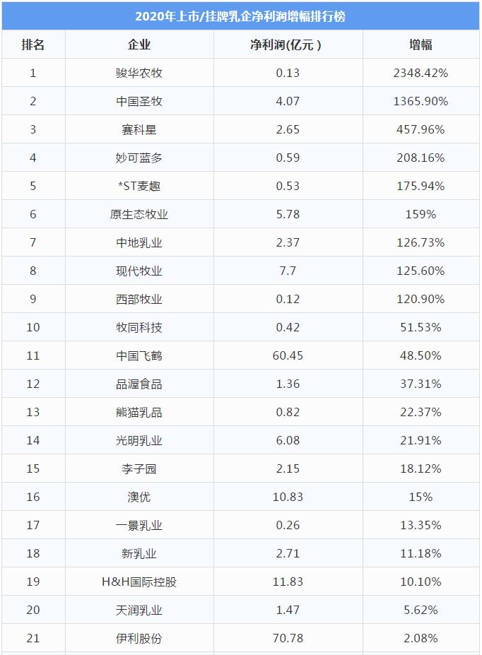 33家上市/掛牌乳企2020年的凈利潤增幅大排名