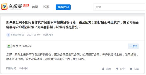 近日,有投資者在互動平臺上提問:如果貴公司不能向合作代養(yǎng)豬的農(nóng)戶提供足夠仔豬,甚至因?yàn)闆]有仔豬而停止代養(yǎng),貴公司是否需要向農(nóng)戶進(jìn)行補(bǔ)償?如果有補(bǔ)償,補(bǔ)償標(biāo)準(zhǔn)是什么?
