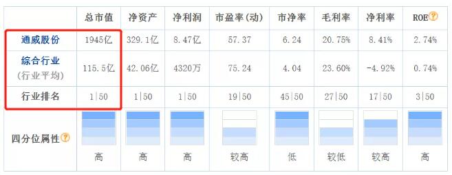 受業(yè)績預(yù)增刺激,今天通威股份開局較昨日43.27元/股的收盤價出現(xiàn)大幅上漲,以44.71元/股開盤,增幅3.33%,也讓公司的總市值再次突破2000億大關(guān),最高時達(dá)到2042億元。截至下午三點收盤時,通威股份總市值盡管回落至1945億元,但仍在東方財富網(wǎng)所細(xì)分的“綜合行業(yè)”中排列第一。