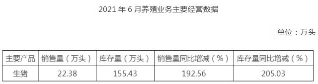 2021年1-6月,公司累計(jì)銷售生豬125.92萬頭,銷售量同比增長183.27%。