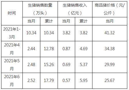 2021年6月份,公司商品豬銷售均價25.67元/公斤,其中:供港活大豬均價27.32元/公斤、內(nèi)銷商品肉豬均價14.85元/公斤。