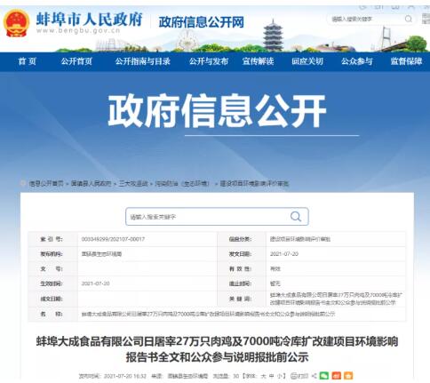 7月20日,安徽省蚌埠市政府發(fā)布公告稱,蚌埠大成食品有限公司擬投資65000萬元位于安徽省蚌埠市固鎮(zhèn)縣經(jīng)一路東側與劉集路交叉口的空地新建廠房,實施“日屠宰27萬只肉雞及7000噸冷庫擴改建項目(根據(jù)小編計算,如果滿負荷生產(chǎn),年屠宰肉雞近1億只)”。