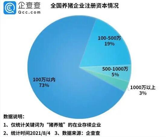 注冊(cè)資本上,注冊(cè)資本在100萬(wàn)以內(nèi)的養(yǎng)豬企業(yè)是該市場(chǎng)的主力軍,占據(jù)了總量的73%,而注冊(cè)資本在1000萬(wàn)以上的,僅占3%。