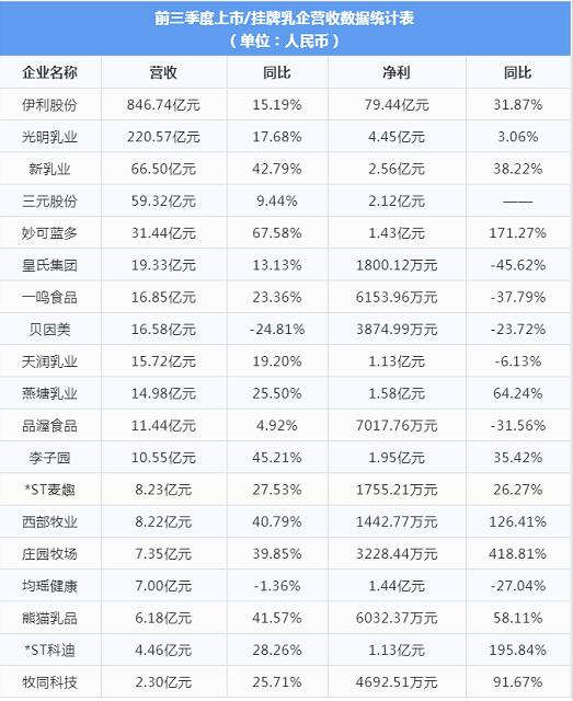 前三季度營收增長最快的是妙可藍多,同比增長67.58%;凈利增長最快的是莊園牧場,同比增長418.81%。