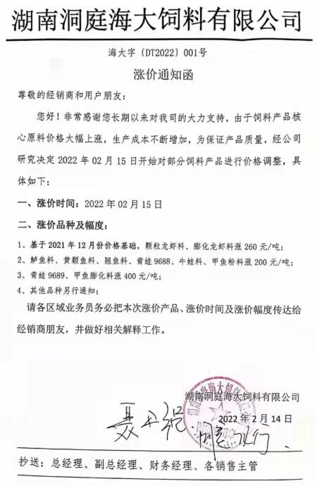 這是進(jìn)入2022年后第二輪大漲價(jià)。今年華中地區(qū)第一輪漲價(jià)是從1月6日起直至1月25日,長達(dá)20天時(shí)間里,海大、通威、新希望、大北農(nóng)、澳華、湘大等飼料巨頭多個(gè)子公司均漲價(jià),當(dāng)時(shí)漲價(jià)主要品種為蝦蟹料,漲幅為200元/噸。