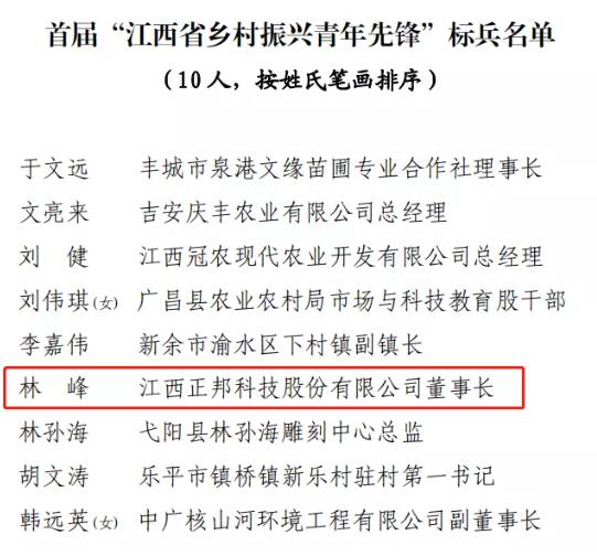 為深入貫徹落實(shí)習(xí)近平新時(shí)代中國(guó)特色社會(huì)主義思想,響應(yīng)省委、省政府實(shí)施鄉(xiāng)村振興戰(zhàn)略號(hào)召,引導(dǎo)更多青年投身鄉(xiāng)村振興偉大實(shí)踐,2021年10月,共青團(tuán)江西省委、江西省農(nóng)業(yè)農(nóng)村廳聯(lián)合啟動(dòng)了首屆“江西省鄉(xiāng)村振興青年先鋒”評(píng)選活動(dòng),得到了社會(huì)青年廣泛報(bào)名。近日,共青團(tuán)江西省委、江西省農(nóng)業(yè)農(nóng)村廳發(fā)布表彰決定,授予正邦科技董事長(zhǎng)林峰等 10 名同志首屆“江西省鄉(xiāng)村振興青年先鋒”標(biāo)兵榮譽(yù)稱號(hào)。