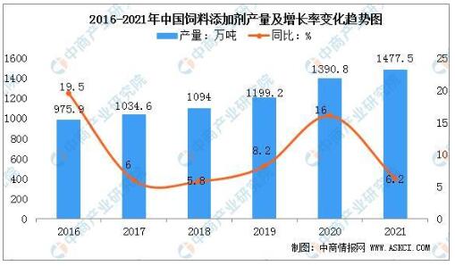 我國(guó)飼料添加劑產(chǎn)量自2016年以來(lái)呈現(xiàn)穩(wěn)步上升趨勢(shì)。2020年,全國(guó)飼料添加劑產(chǎn)量1390.8萬(wàn)噸,同比增長(zhǎng)16%,2021年全國(guó)飼料添加劑總產(chǎn)量1477.5萬(wàn)噸,比上年增長(zhǎng)6.2%。